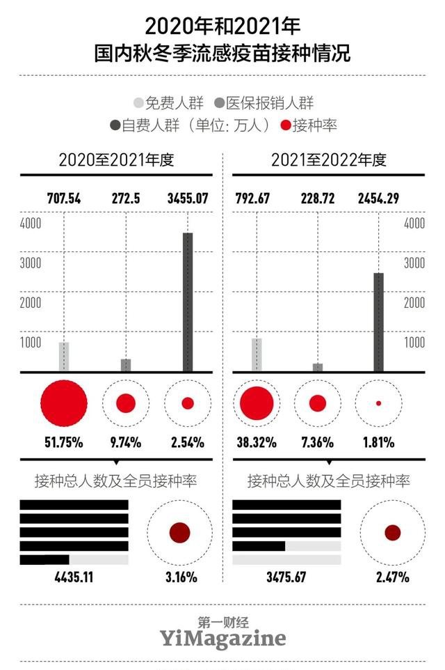 现阶段,我国免费接种政策覆盖的人群主要是学龄前儿童、中小学生、老年人等。根据《中华预防医学》在2022年8月发布的一篇有关流感疫苗的接种情况调查,免费接种政策覆盖人群的接种率在2020年秋冬季为51.75%,但是到了2021年秋冬季,接种率只有38.32%。