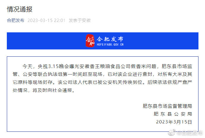 紧接着,合肥发布微信公众号15日晚发布情况通报称,针对晚会曝光的安徽香王粮油食品公司假香米问题,肥东县市场监管、公安等联合执法组第一时间赶至现场,已对该企业进行查封,对所有大米及其他原料等现场封存。该公司法人代表已被公安机关传唤到位。后续依法依规严查严处情况,将及时向社会通报。