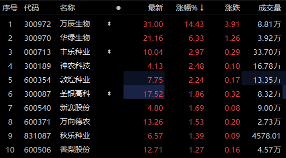 农业板块今日(3月16日)早盘逆势走高,截至发稿,万辰生物涨超14%,华绿生物涨超6%,丰乐种业、神农科技、敦煌种业等跟涨。