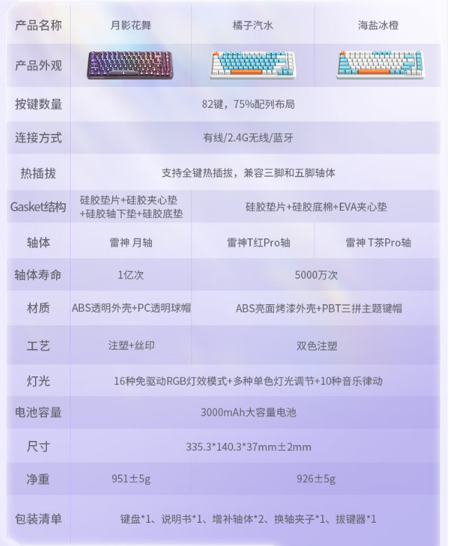 轴体部分,“橘子汽水”配色选用 T 红 PRO 轴,按压力度偏小,直上直下的手感,适合文字工作者;“海盐冰橙”配色选用 T 茶 PRO 轴,按压以及回馈力度均较适中,适合游戏用户;“月影独舞”配色则是选用高透月轴,触发以及回弹均十分迅速,适合电竞玩家。