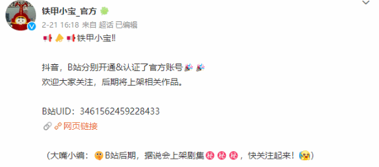 上个月,《铁甲小宝》分别在B站和抖音开通了官方账号。并表示,后期可能会在B站上线剧集,网友们呼声最大的就是推出高清修复版。