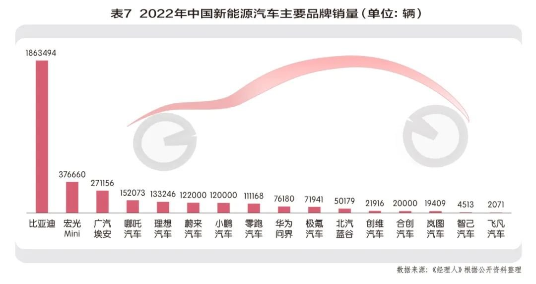 根据国内新能源汽车品牌各家的公开统计,2022年,16大国内新能源车车企年终贡献341万辆汽车。其中排名前三位的分别为比亚迪186.35万辆、宏光Mini37.67万辆、 广汽埃安27.12万辆(表7)。
