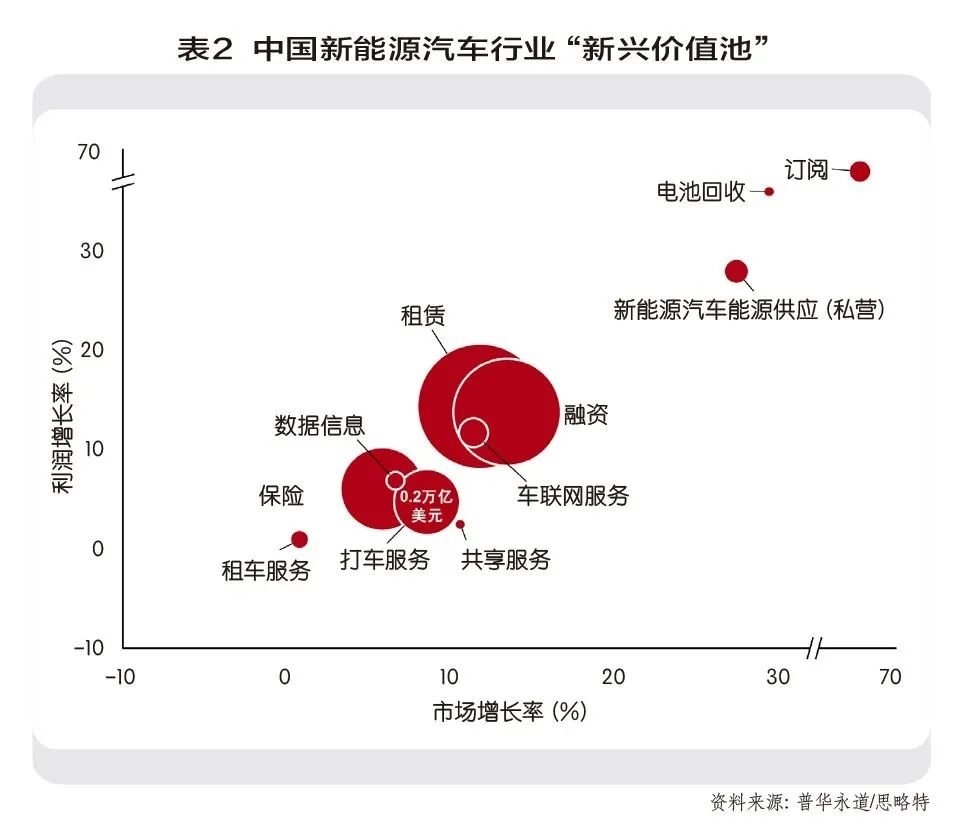 此外,中国新能源汽车行业这些年来,通过摸索和实践,还形成了一个新兴的市场价值系统。根据普华永道/思略特的报告③,中国新能源汽车行业出现了一个完全有别于传统汽车时代的新兴价值池,其中包括租车服务、打车服务、保险、数据和信息、共享服务、车联网服务、租赁、融资、能源供应、电池回收、订阅等11项结构新生的子行业。
