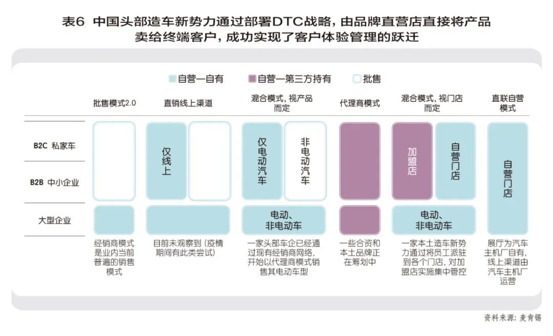 “中国的头部造车新势力通过部署DTC战略模式(表6),由品牌直营店直接将产品卖给终端客户,成功实现了客户体验管理的跃迁,也标志着其与传统车企4S店主导的销售模式开始分庭抗礼⑥。”根据麦肯锡的观察和总结,国内造车新势力这些年来,通过DTC战略模式,已经越来越熟练运用于该经营模式,并且运用于海外终端。
