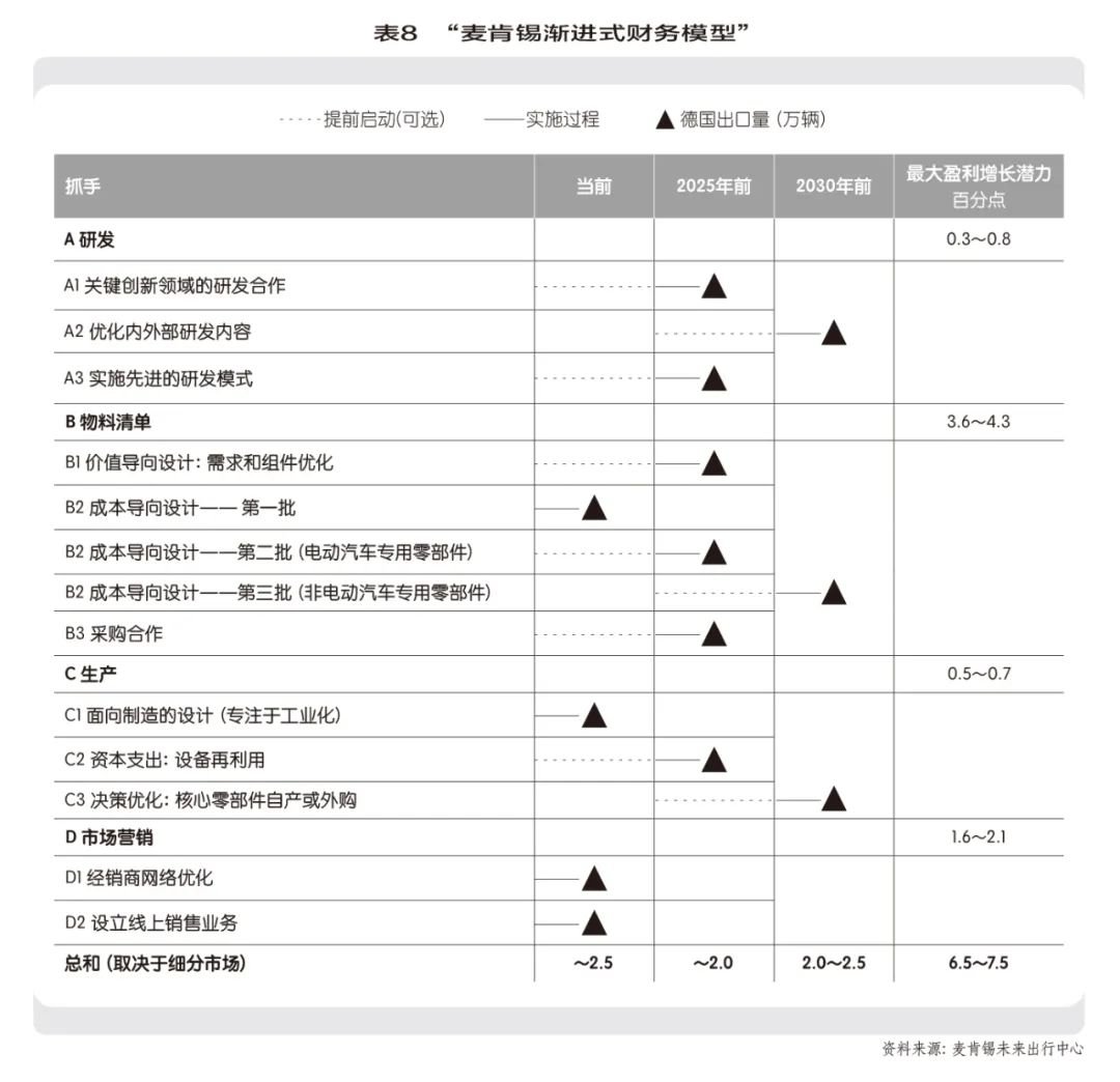 先关注前者——我们将其称为“麦肯锡渐进式财务模型(表8)”。该财务模型共分三个阶段实施,最高盈利潜力提升6%-8%。其从纵向维度,主要为研发控制、物料清单控制、生产控制、市场营销控制等四大结构,下辖13个控制单元;从横向维度,则从当前到2025年、2030年等三个时间阶段分别实施有关13个控制单元的“盈利解锁”。