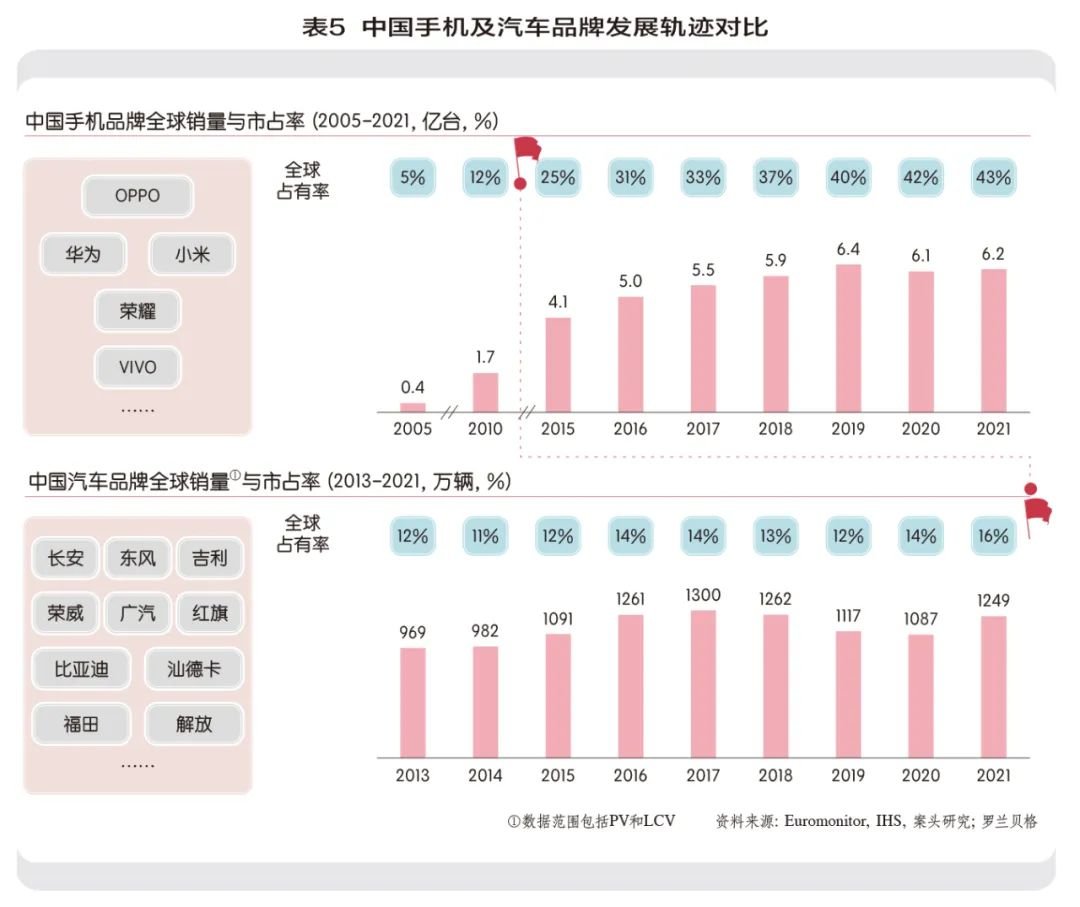 “以中国手机行业全球化发展历程为鉴,中国经过约15年的耕耘,产生了多个具有全球影响力的手机品牌,并在全球市场占据了超过40%的市场份额。回顾十多年前的中国手机行业,一众国产手机品牌逐一问世,基于安卓系统开发符合中国用户习惯的用户界面(UI)系统和软件,并依靠国内消费电子产业链主打性价比,不仅在国内市场对苹果、三星等国际玩家产生了冲击,也在出口之后让中国品牌深深植入国外消费者群体(表5)。”罗兰贝格以“中国手机品牌军团”的全球化,来对比和预测“中国新能源汽车军团”的国际化结果。