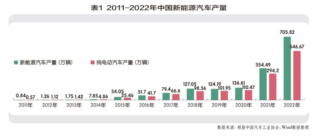 数据即结果。即使不将混动型电动车计算在内,仅以纯电动汽车为对象,根据中国汽车工业协会、Wind的统计,以2011年至2022年为时间维度,在产量上,从0.57万辆猛增至546.67万辆,而在保有量方面,截止2022年,已达1310万辆(表1)。