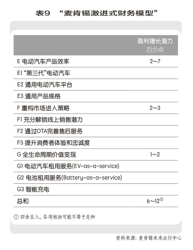 再关注后者——我们将其称为“麦肯锡激进式财务模型(表9)”。该模型分为三大结构:“电动汽车产品效率”“重构市场进入策略”“企业生命周期价值变现”。下辖9个控制单元。