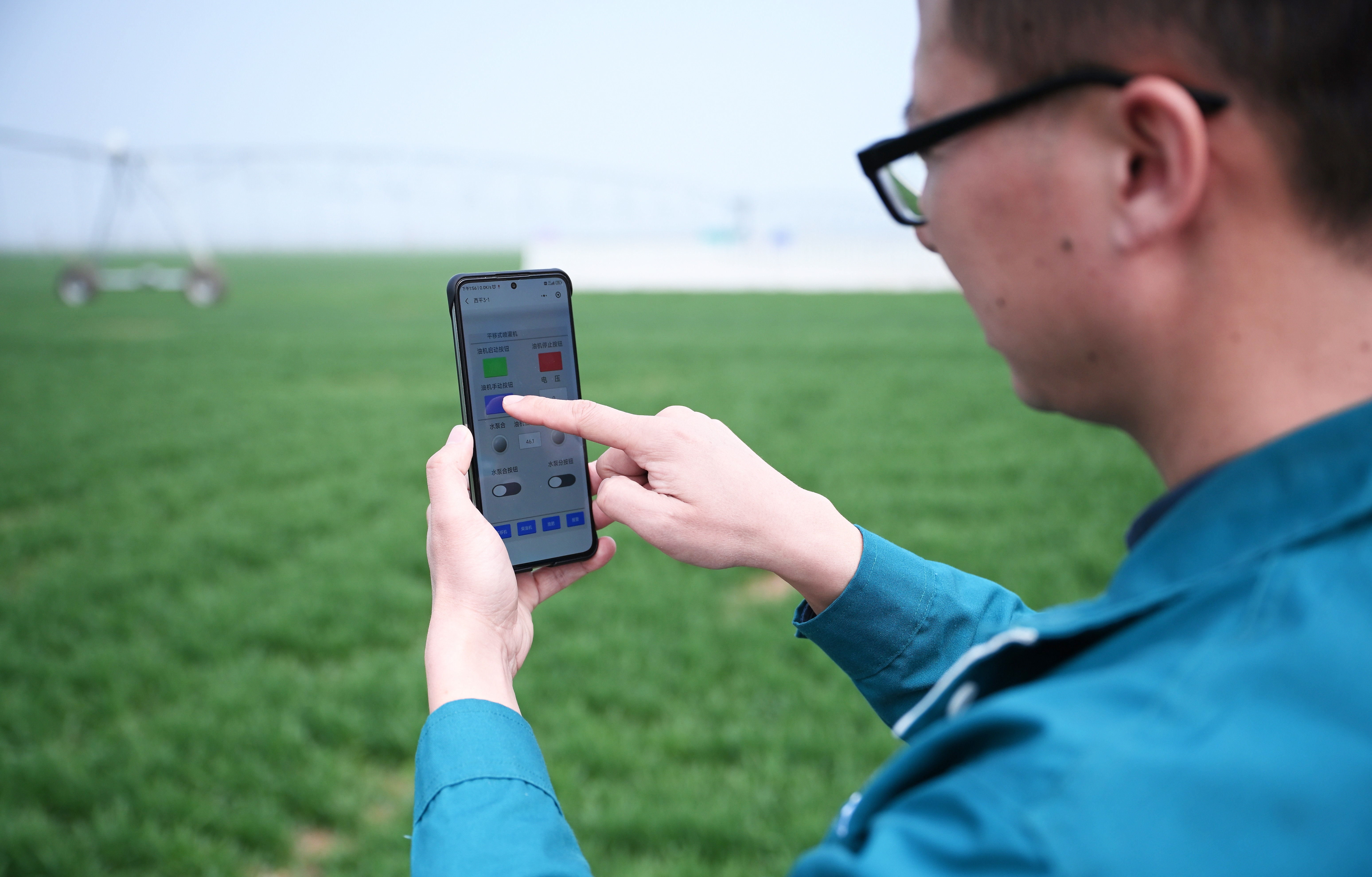 在西平县老王坡高标准农田示范区,刘亚辉通过手机远程操作平移式水肥一体化喷灌机。新华社记者 张浩然 摄