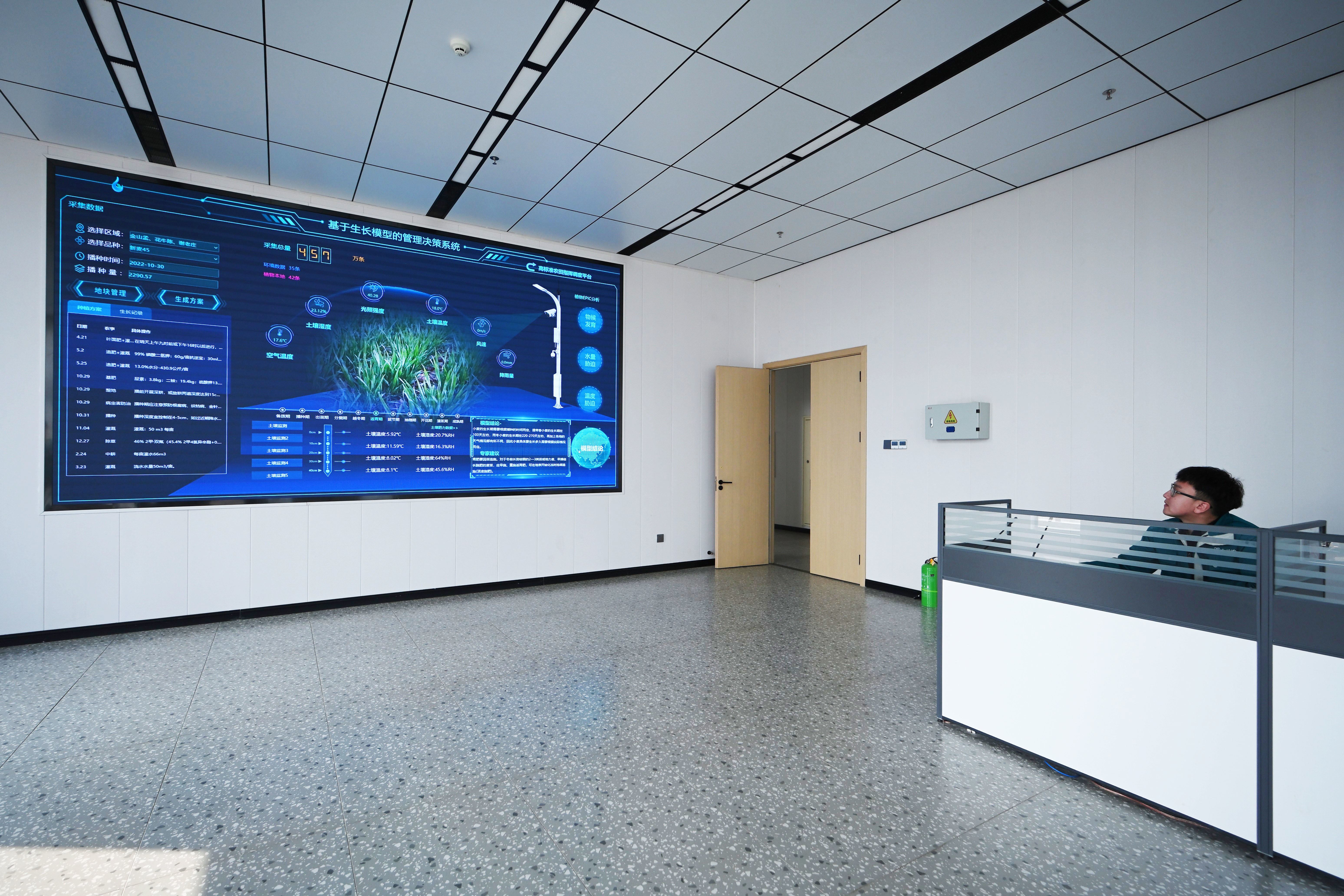 在一楼数据控制中心,气象、水质、墒情、苗情、虫情“一屏统揽”。物联网控制着250多个自动化喷灌设备和墒情、虫情等智能终端,浇地、施肥,手机一键管控。