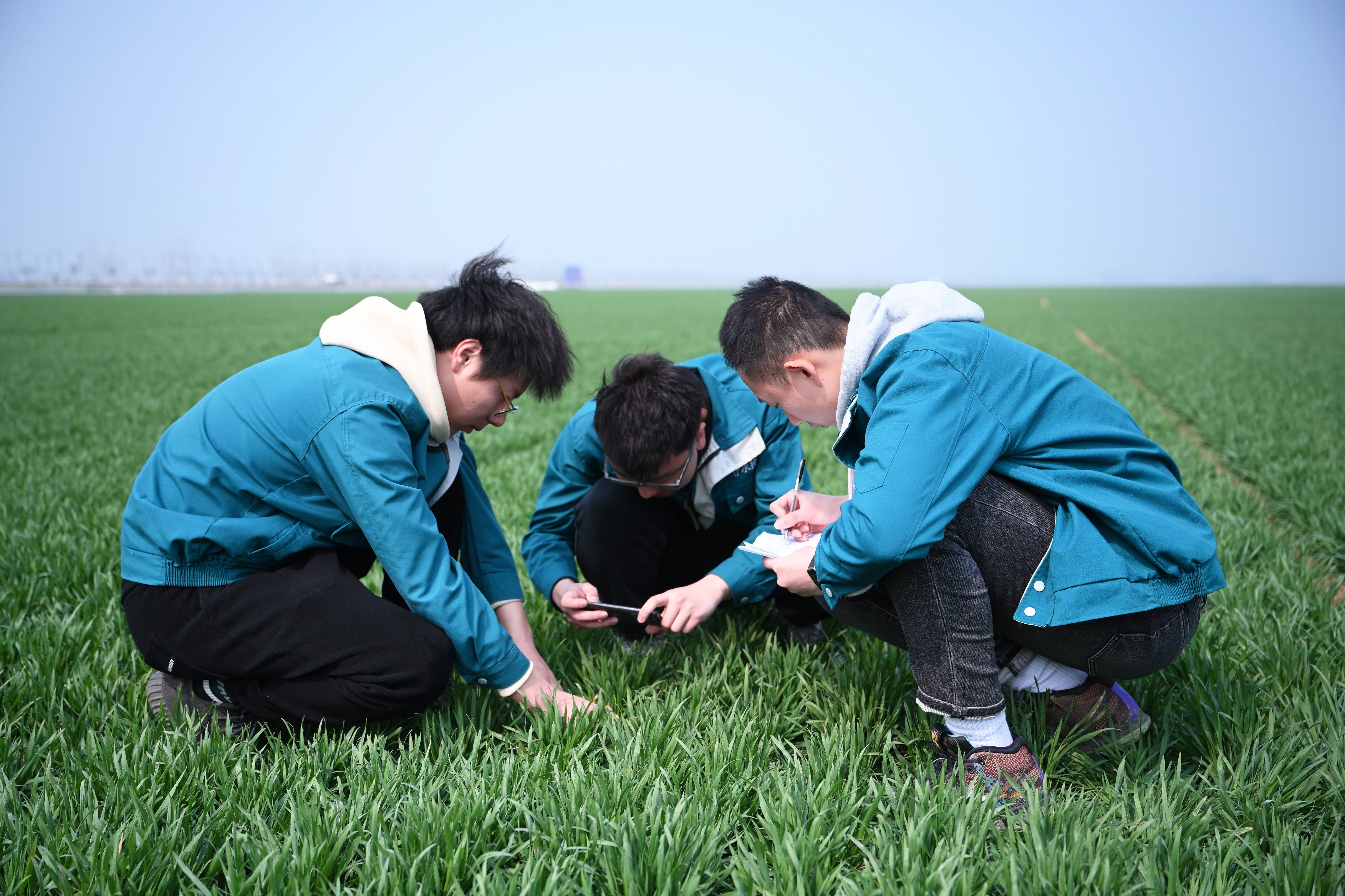 在西平县老王坡高标准农田示范区,台晓林(左)、王仲琦和王英凡(右)一起查看苗情草情并做记录。新华社记者 张浩然 摄