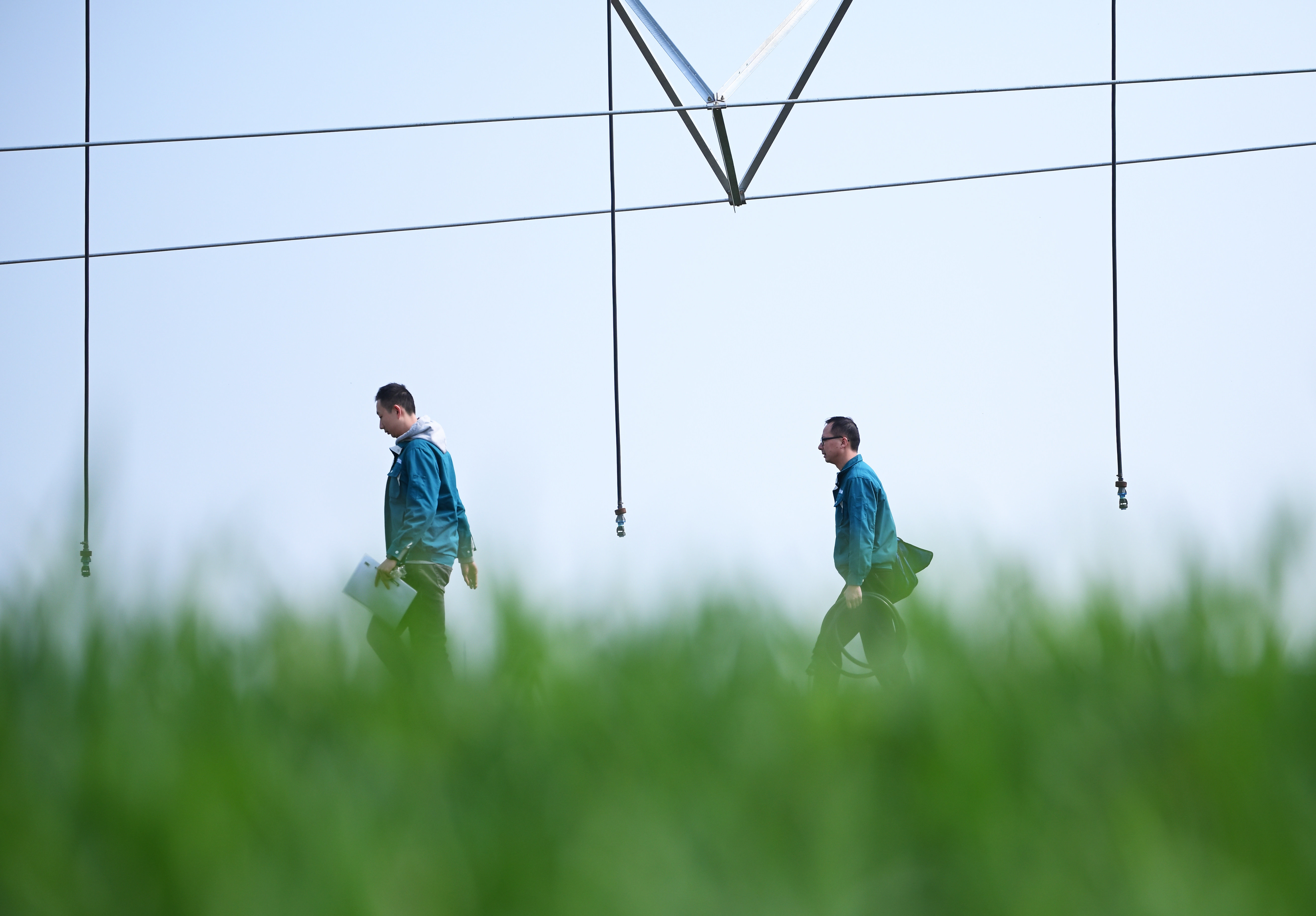 在西平县老王坡高标准农田示范区,刘亚辉(右)和王英凡在对平移式水肥一体化喷灌机进行巡检。新华社记者 张浩然 摄
