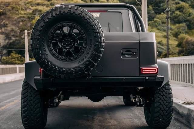 车身方面,全车采用了哑光黑涂装,非常符合这车气质,定制的前金属保险杠中间集成了绞盘。定制的金属后护杠集成了备胎支架,更短的前后杠也使接近角和离去角大大增加。