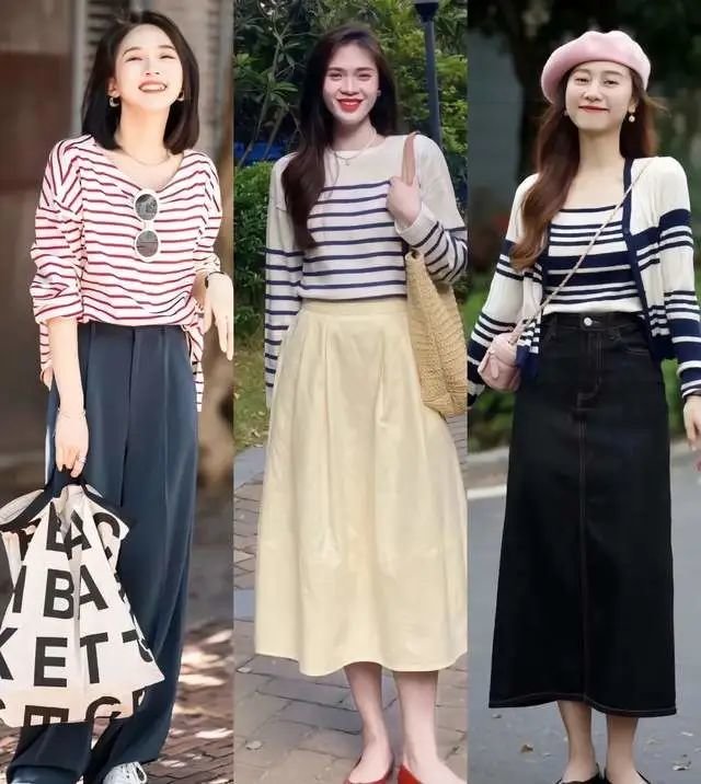 红白条纹衫会有一种活泼可爱的少女感,蓝白条纹与黑白条纹都很清爽,而且特别显白,搭配半身裙或烟管裤,都好看。