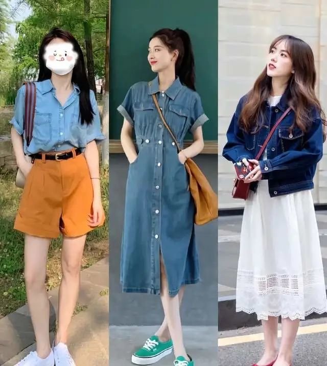 水蓝色牛仔衬衫,很帅气的感觉,搭配暖橘色短裤,撞色的搭配,看起来特别的时髦。藏青色牛仔衣搭配白色连衣裙,很清纯干净的配色,显得人更青春。