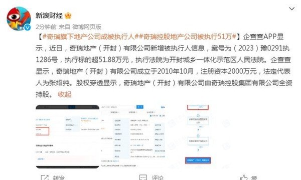 【CNMO新闻】3月17日,企查查APP显示,近日,奇瑞地产(开封)有限公司新增被执行人信息,案号为(2023)豫0291执1286号,执行标的超51.88万元,执行法院为开封城乡一体化示范区人民法院。