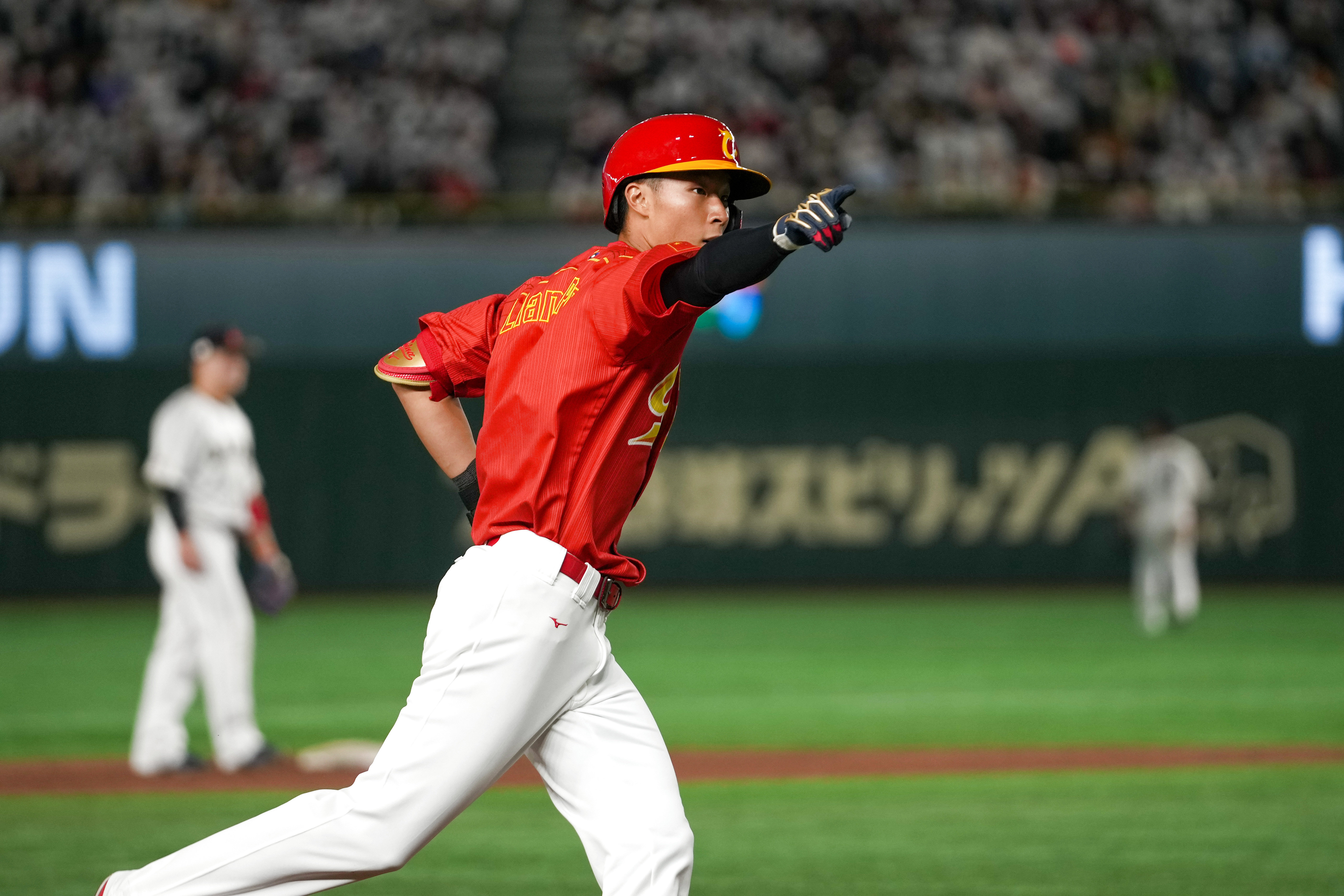 3月9日,梁培庆祝打出本垒打