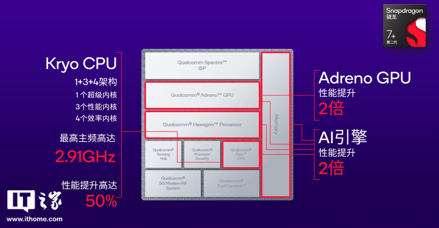 AI 方面,第二代骁龙 7 + 集成了高通传感器中枢,基于全新低功耗 AI 架构,包括一颗专用 AI 处理器、DSP 和专属的内存。