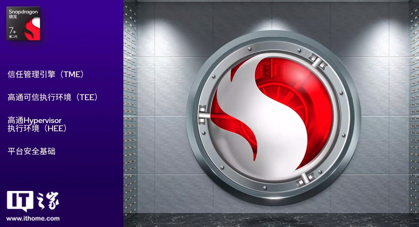 最后在安全方面,第二代骁龙 7 + 支持信任管理引擎(TME)以及高通可信执行环境(TEE)。此外它还有 Hypervisor 执行环境(HEE)加持,可以将不同应用运行在独立 OS 上,而且是运行在芯片内部的一块独立区域。这样做的好处是,比如说应用中的指纹识别或人脸检测,能够与系统 OS 区隔开,从而保证这些应用的安全性。