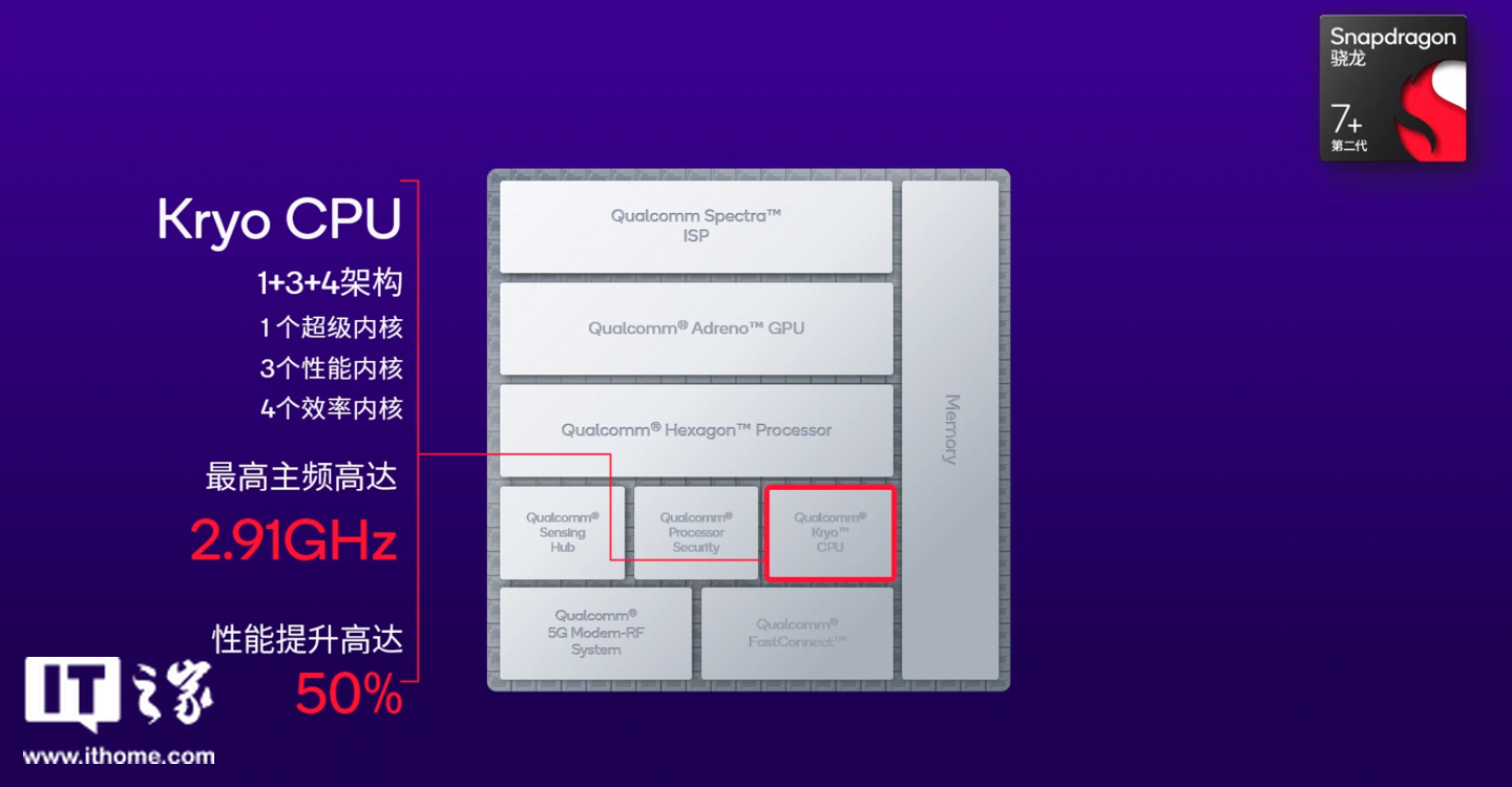 首先,第二代骁龙 7 + 移动平台采用了 Kryo CPU,1+3+4 架构,包括 1 个最高主频 2.91GHz 的超级内核,3 个性能内核和 4 个效率内核,CPU 整体性能比上一代平台提升 50%。