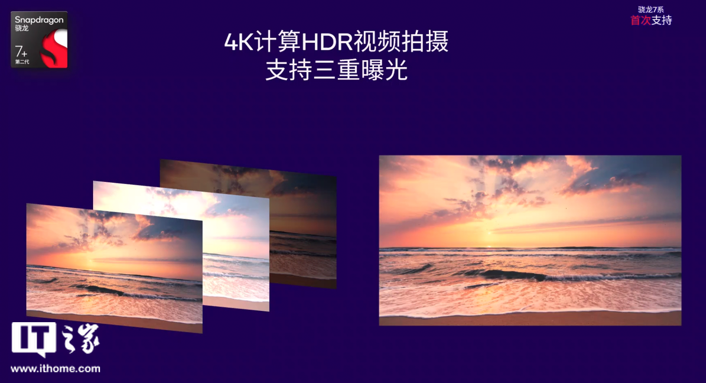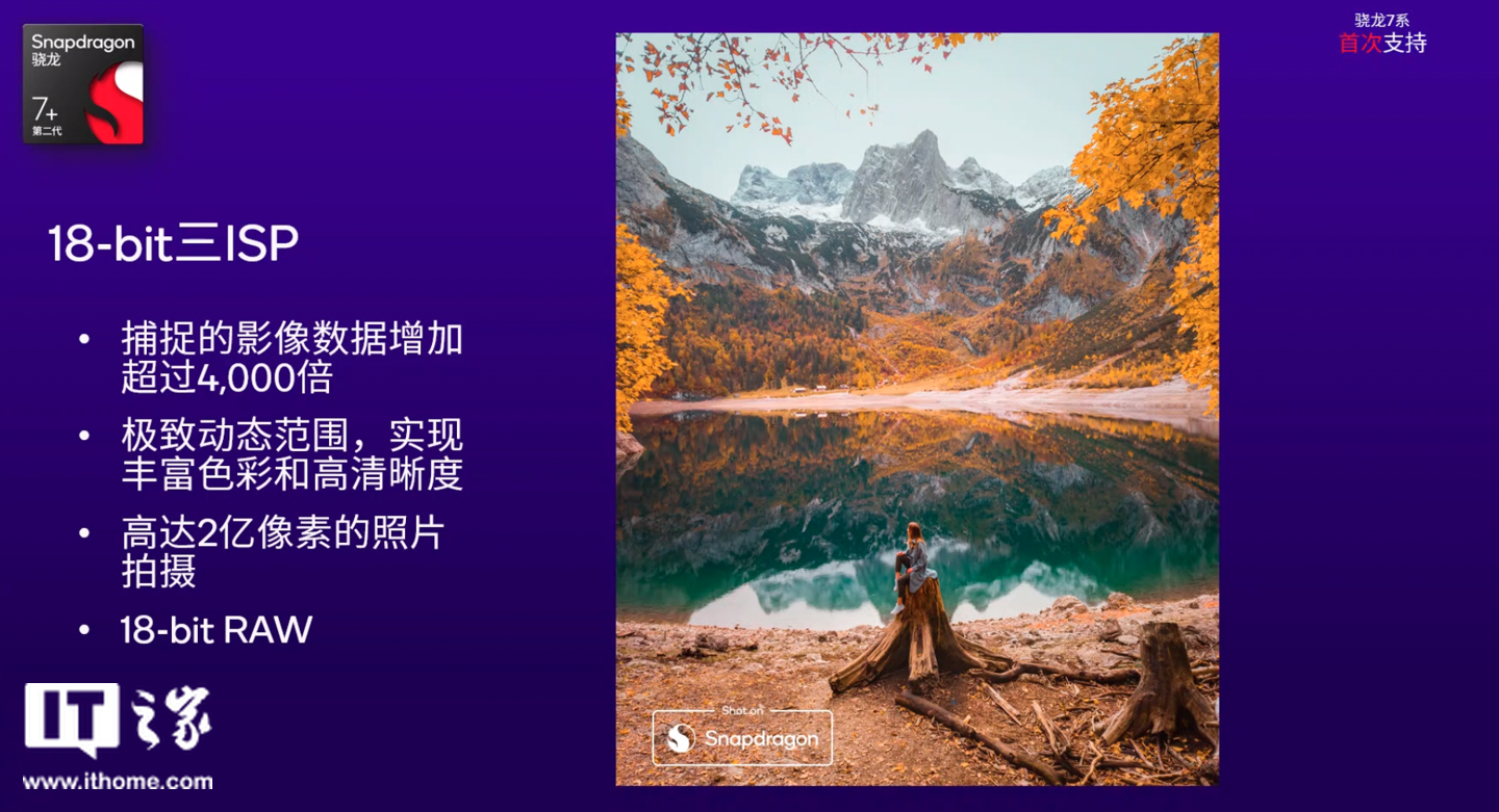 除了 CPU、GPU,第二代骁龙 7 + 移动平台在影像能力上也有升级。它是首个在骁龙 7 系上支持 18-bit 三 ISP 的移动平台。相比 14-bit ISP,18-bit ISP 捕捉的影像数据增加了超过 4000 倍,它可以提供极致动态范围,还原丰富色彩和实现高清晰度,拍摄效果相比 14-bit ISP 有了质的提升。
