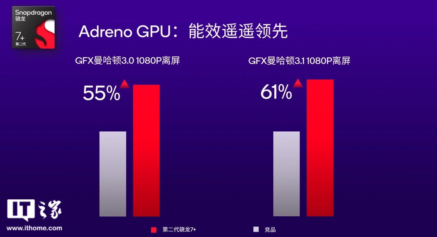 GPU 能效方面,第二代骁龙 7 + 的 Adreno GPU 在包括 GFX 曼哈顿 3.0 1080P 离屏测试和 GFX 曼哈顿 3.1 1080P 离屏测试中,领先优势分别达到 55% 和 61%。