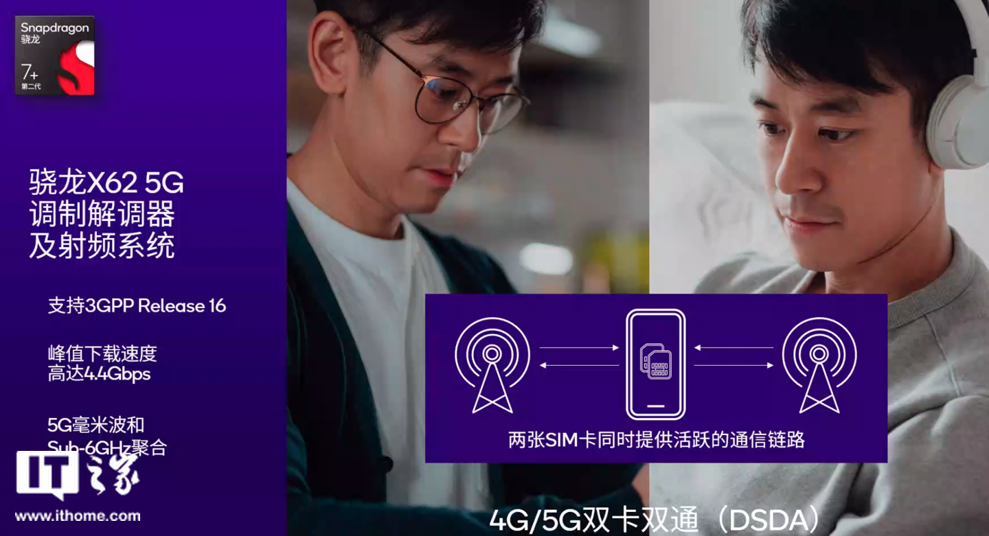 在通信方面,第二代骁龙 7 + 集成了骁龙 X62 5G 调制解调器及射频系统,支持 3GPP Release 16,峰值下行速率高达 4.4Gbps。它还支持 5G 毫米波和 Sub-6GHz,并且可以支持两者之间的载波聚合。