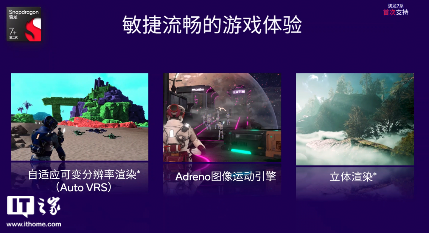 而在游戏方面,第二代骁龙 7 + 也把把很多原来只在骁龙 8 系支持的游戏特性引入了进来,比如自适应可变分辨率渲染(Auto VRS),还有 Adreno 图像运动引擎。此外立体渲染也是首次在骁龙 7 系平台中支持的游戏特性。这一特性结合了虚幻引擎 5 的功能特性,通过与游戏工作室合作,可以对游戏中的烟雾和粒子效果进行进一步渲染,打造极致的逼真度。