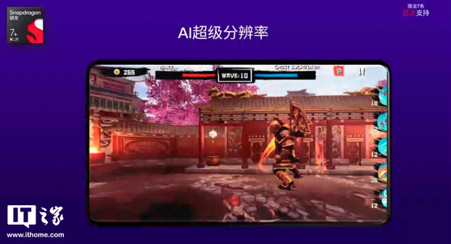 同时高通还首次在骁龙 7 系支持了 AI 超级分辨率特性,简称 AI 超分。它基于已经训练的 AI 超分神经网络模型,结合相应的游戏,可以进一步提升游戏分辨率,比如从原来的 720p 扩展到 1080p 甚至更高,从而提升整个游戏的画质。
