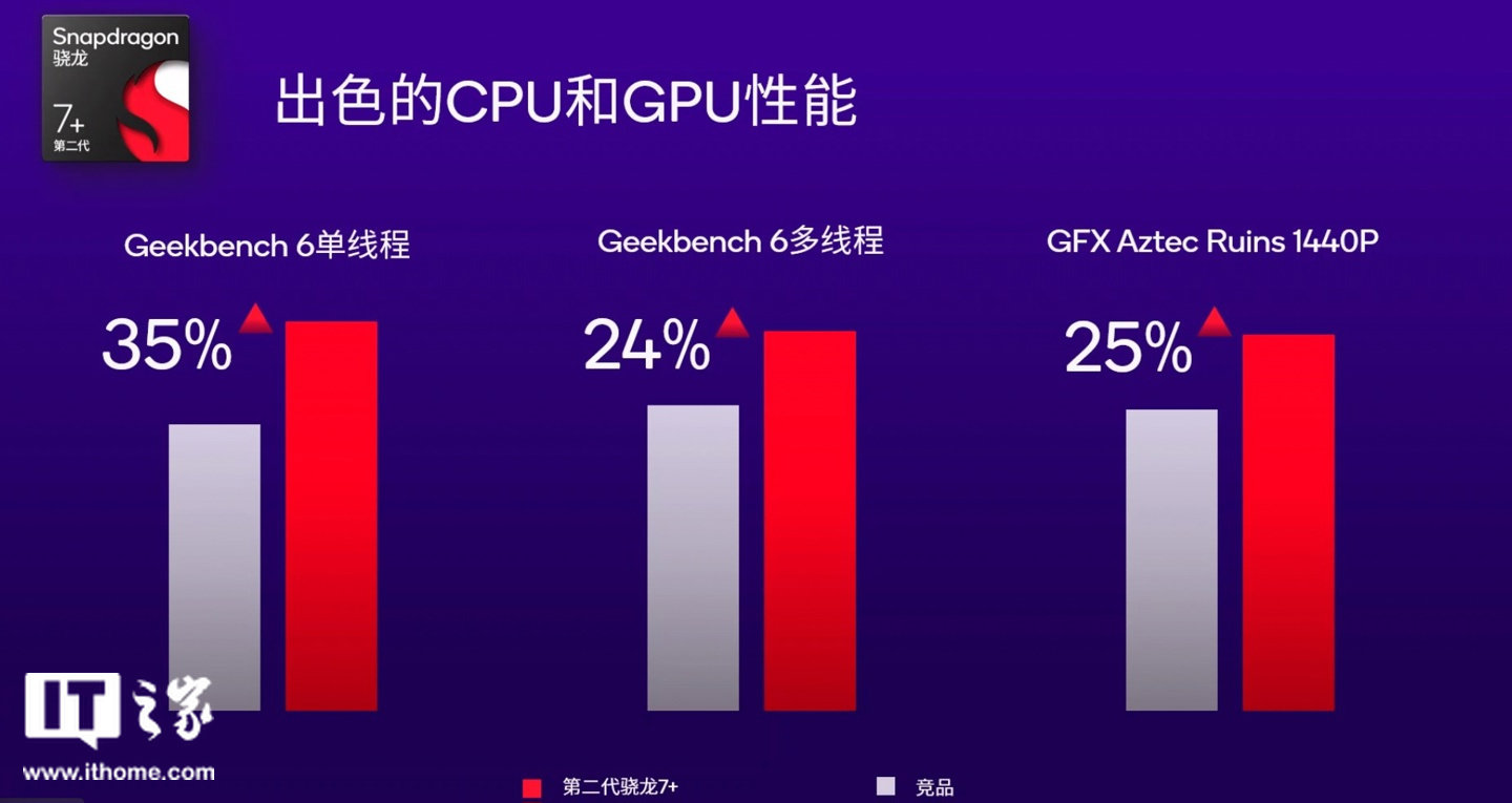 在第二代骁龙 7 + 工程样机与同档位竞品的商用终端在 Geekbench 6 测试的对比中,第二代骁龙 7 + 的 CPU 在单线程上领先达 35%,在多线程上领先达 24%。GPU 性能方面,在 GFX Aztec Ruins 1440P 基准测试中,第二代骁龙 7 + 相比竞品领先 25%。