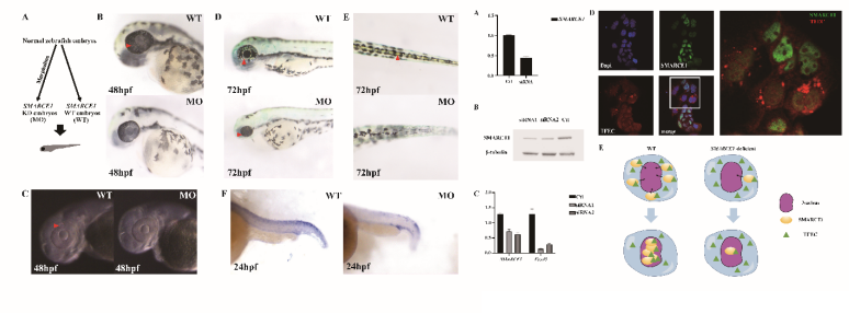 此时,团队先利用斑马鱼胚胎模型,将候选基因SMARCE1【备注:英文倾斜】敲降后发现,胚胎虹彩细胞发育产生了明显异常,同时基因TFEC【备注:英文倾斜】的表达也受到了影响,证实了基因SMARCE1【备注:英文倾斜】与虹彩细胞发育过程的重要联系。