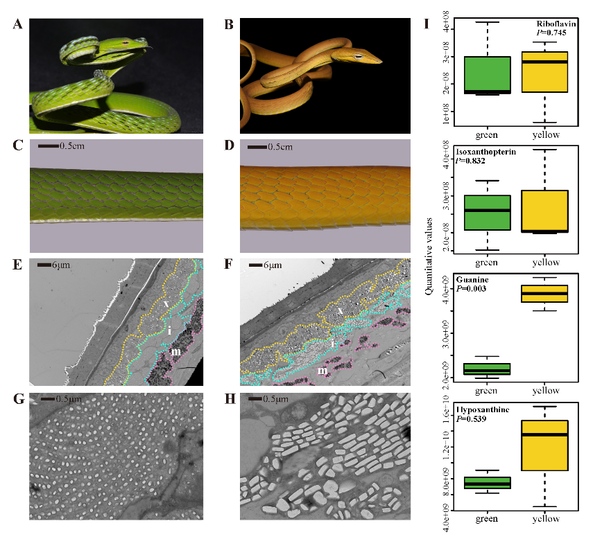 而后发现两种体色的绿瘦蛇在皮肤色素细胞,尤其是虹彩细胞的排列和形态上存在着明显差异。其中黄色个体的皮肤中含有更为无序和相对较厚的虹彩细胞嘌呤晶体;同时,皮肤组织的非靶向代谢组也显示了相同线索,这提示虹彩细胞的形态差异可能是绿瘦蛇两种体色差异的表型基础。