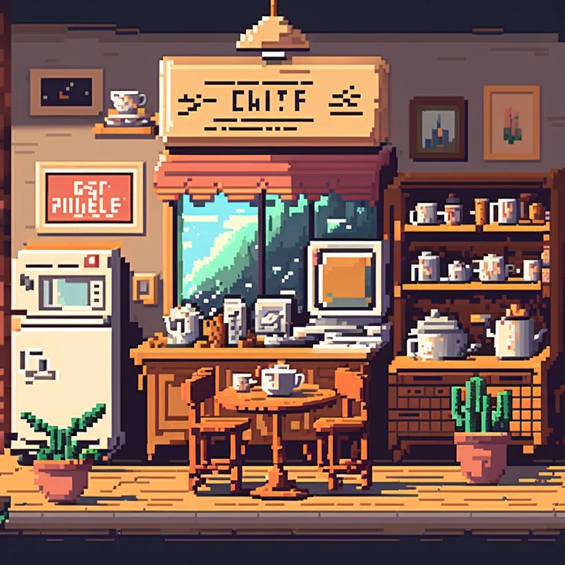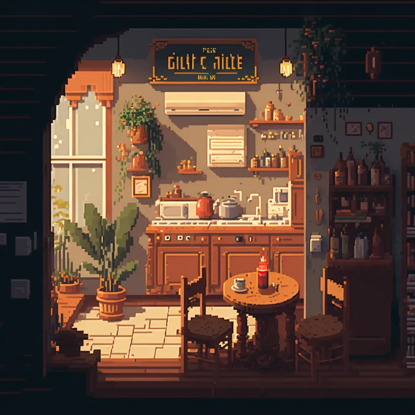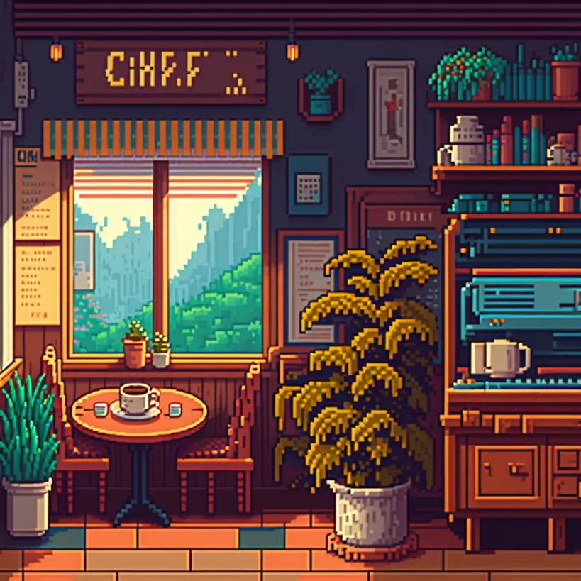 24-bit pixel art, cozy cafe