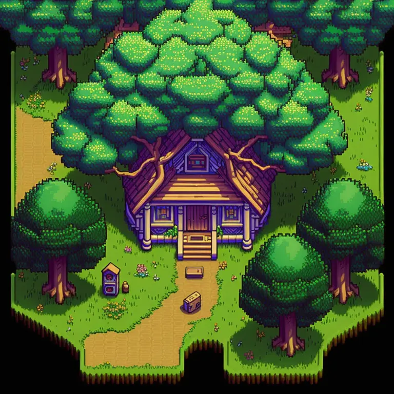 house in the trees, top down2d game, pixel art, style of Legend of Zelda: A Link to the Past (SNES, Game Boy Color)1991