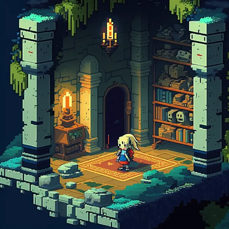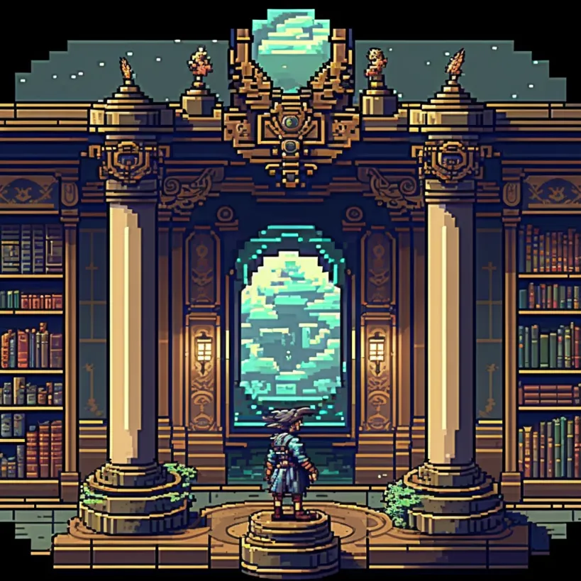 library of alexandria, style of owlboy pixel art