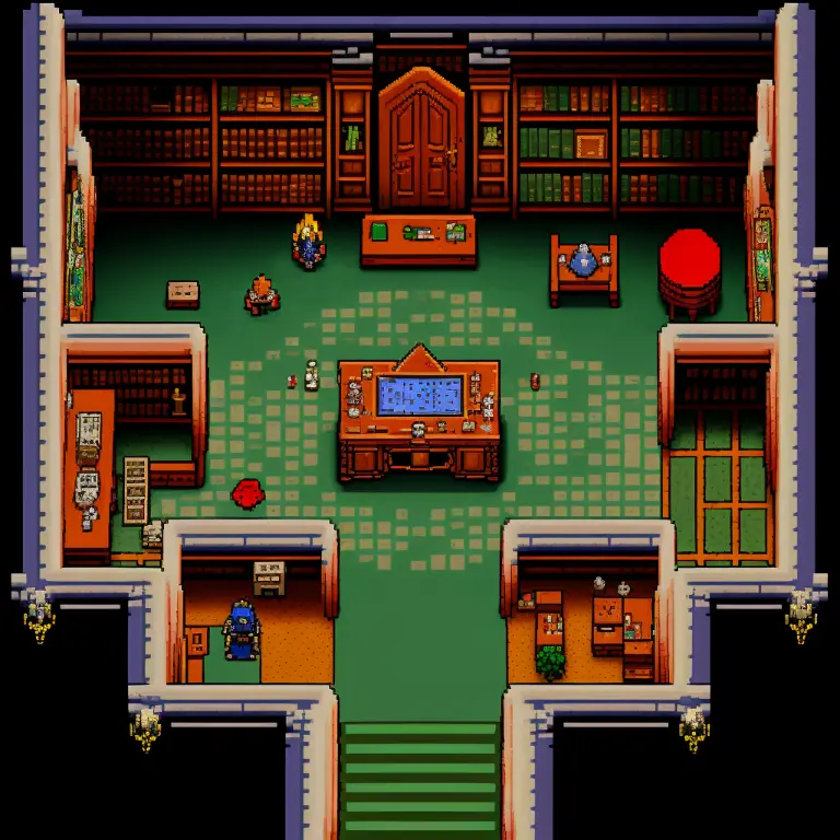 interior of library, top down2d, pixel art, style of Legend of Zelda: A Link to the Past (SNES)1991洞穴故事 (2004)