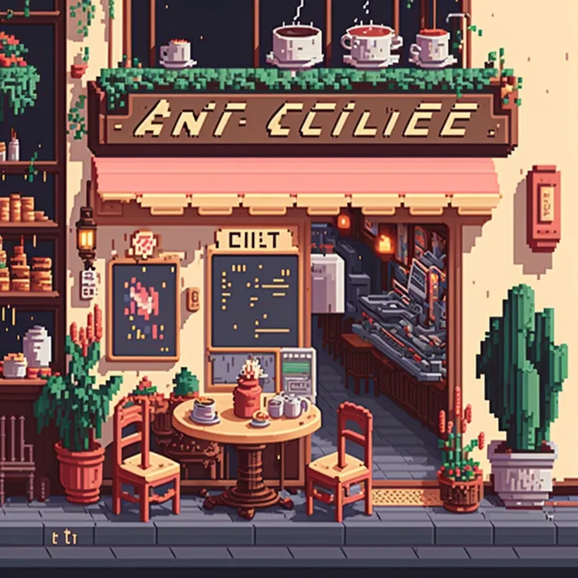 8-bit pixel art, cozy cafe