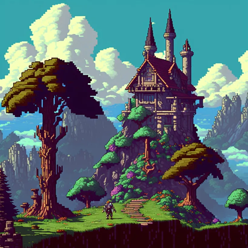 castle on hill, style of owlboy pixel art