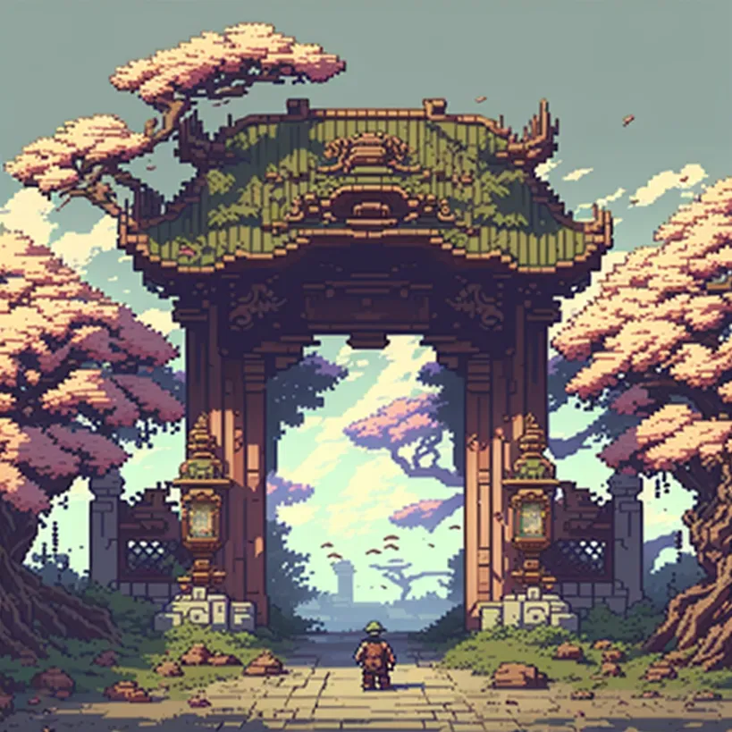 chinese gate, style of owlboy pixel art