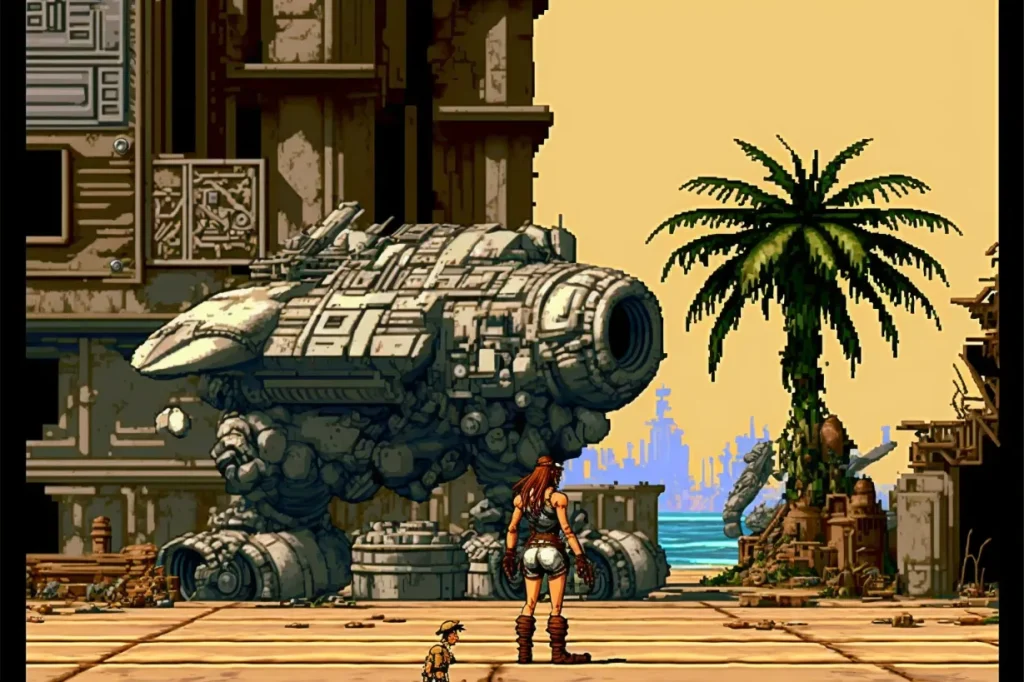 clean pixel art, post apocalyptic city, style of metal slug1996--ar3:2