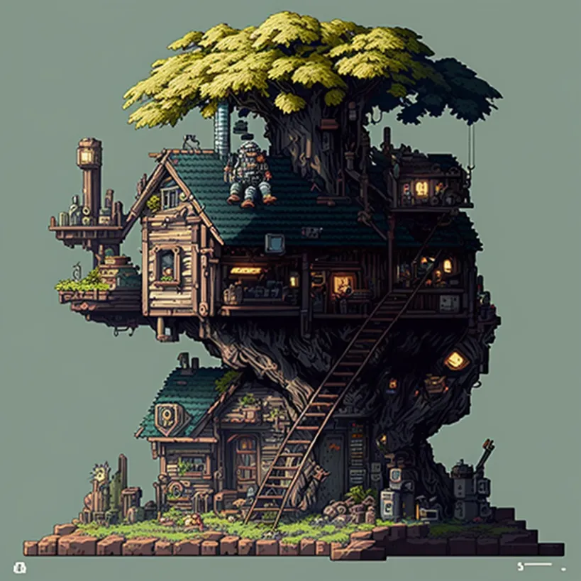 clean pixel art, house inside of a tree, style of metal slug
