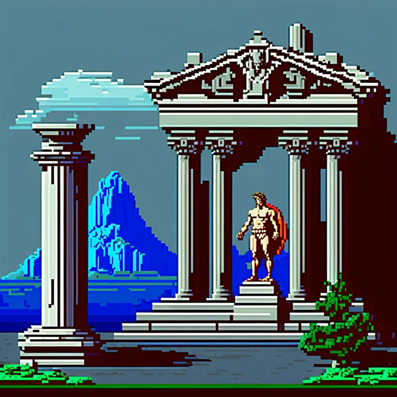 clean pixel art, greek temple with statue of apollo, style of castlevania1986