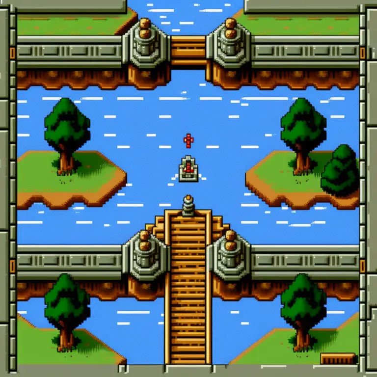 clean pixel art,2d top down game, bridge over water,1991, Legend of Zelda: A Link to the Past (SNES)