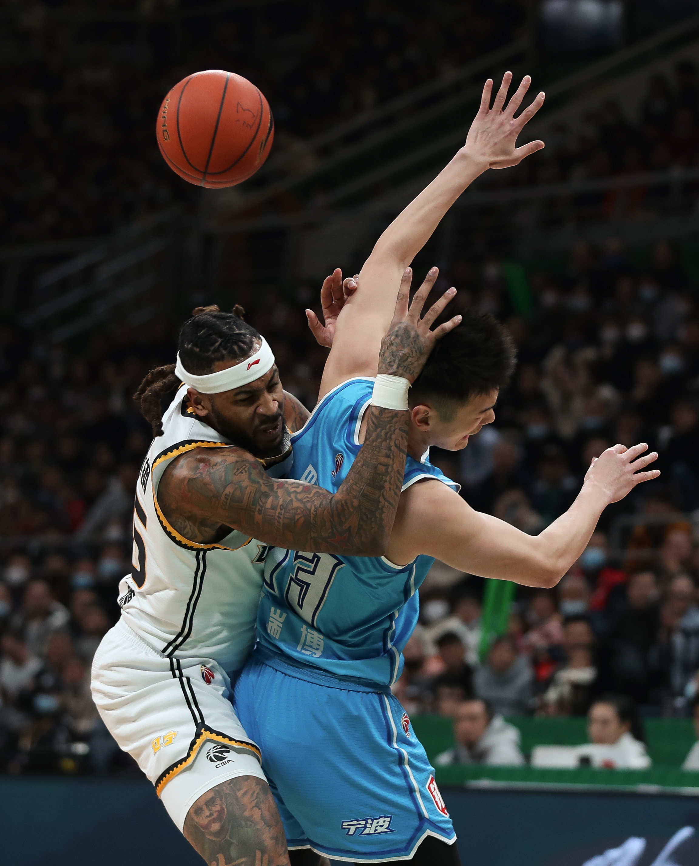 3月17日,辽宁本钢队球员莫兰德(左)在比赛中与宁波町渥队球员党瑞博拼抢。新华社记者 龙雷 摄