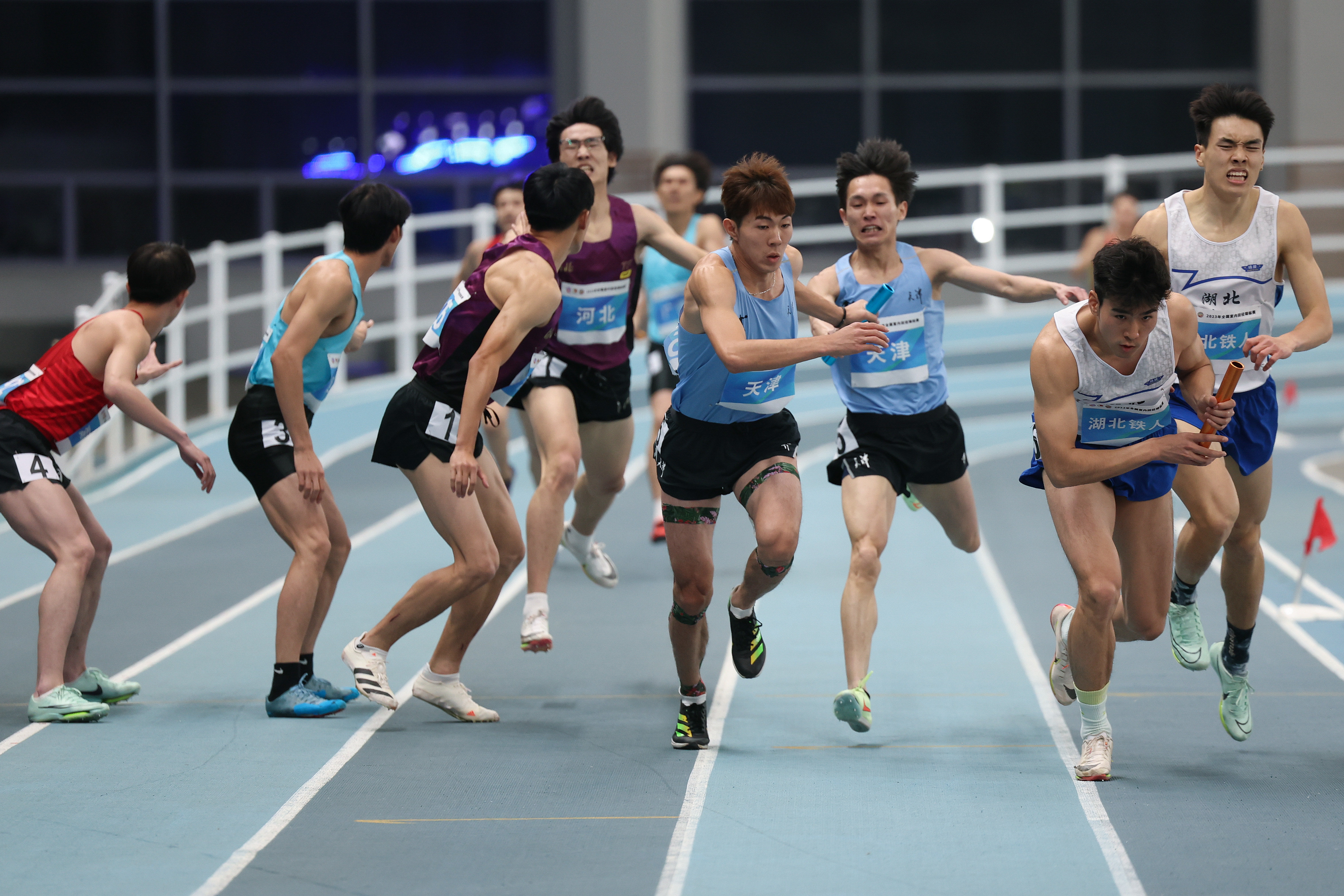 3月17日,天津队第三棒选手吴耀强(右三)与第四棒选手鞠天淇(右四)在比赛中交接棒。新华社记者 李明 摄