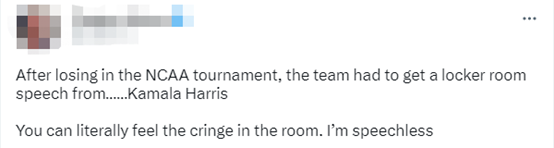 还有网友称,“在美国大学生篮球联赛失利后,球队不得不接受……来自卡玛拉•哈里斯的更衣室演讲。你可以真切地感受到房间里的畏缩和尴尬。我连话都说不出来了”。
