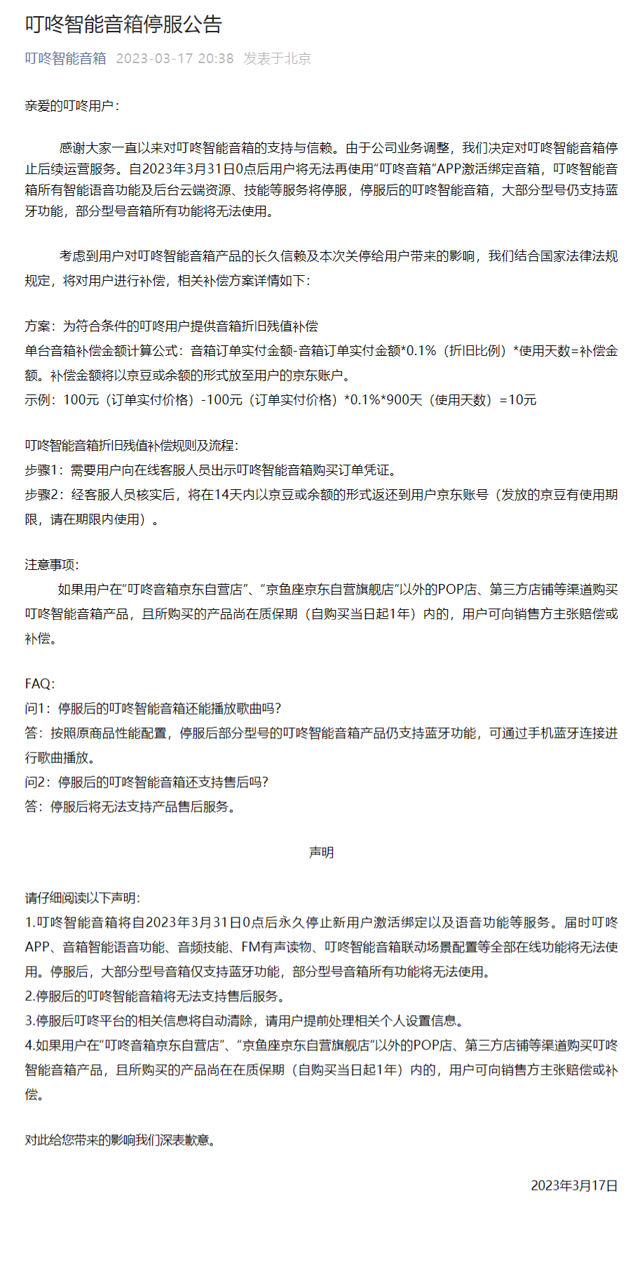 考虑到用户对叮咚智能音箱产品的长久信赖及本次关停给用户带来的影响,叮咚智能音箱结合国家法律法规规定,将对用户进行补偿,相关补偿方案详情如下: