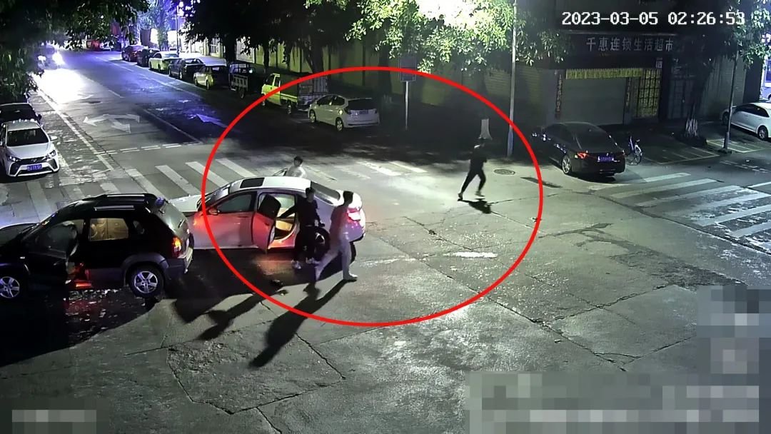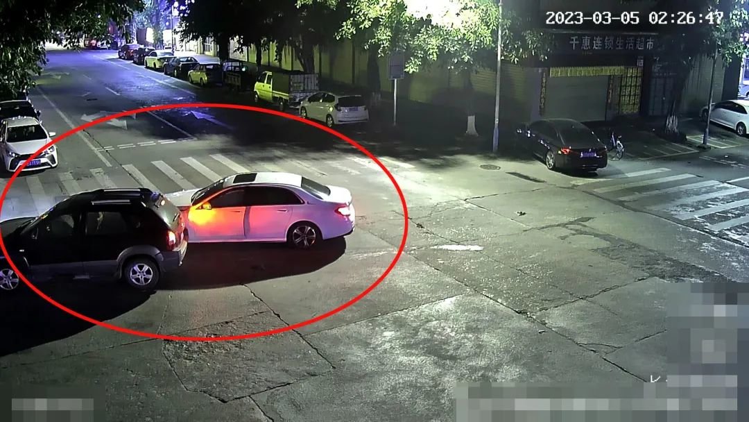 3月5日凌晨两点许,在开平长福街祥苑北路十字路口发生了一起两车碰撞的交通事故。由现场公共视频可以看出,碰撞事故发生后,白色轿车内4名驾乘人员立即下车逃跑,而后黑色小车驾驶人选择了报警处理。