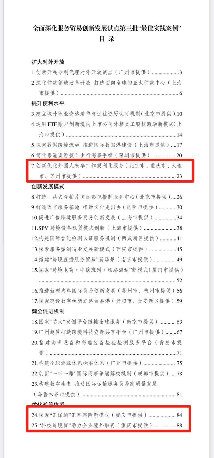 近日,重庆市“创新优化外国人来华工作便利化服务”、“探索‘汇保通’汇率避险新模式”、“‘科技跨境贷’助力企业境外融资”三个案例入选国务院服务贸易发展部际联席会议办公室全面深化服务贸易创新发展试点第三批“最佳实践案例”,案例数量居中西部第一。