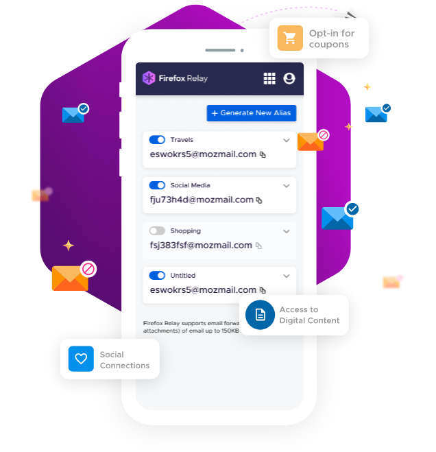 我们安全易用的马甲邮箱和虚拟手机号可帮助您保护自己的身份隐私。使用此服务来匿名创建账户,免受垃圾短信和骚扰电话侵扰,让收件箱重归宁静。